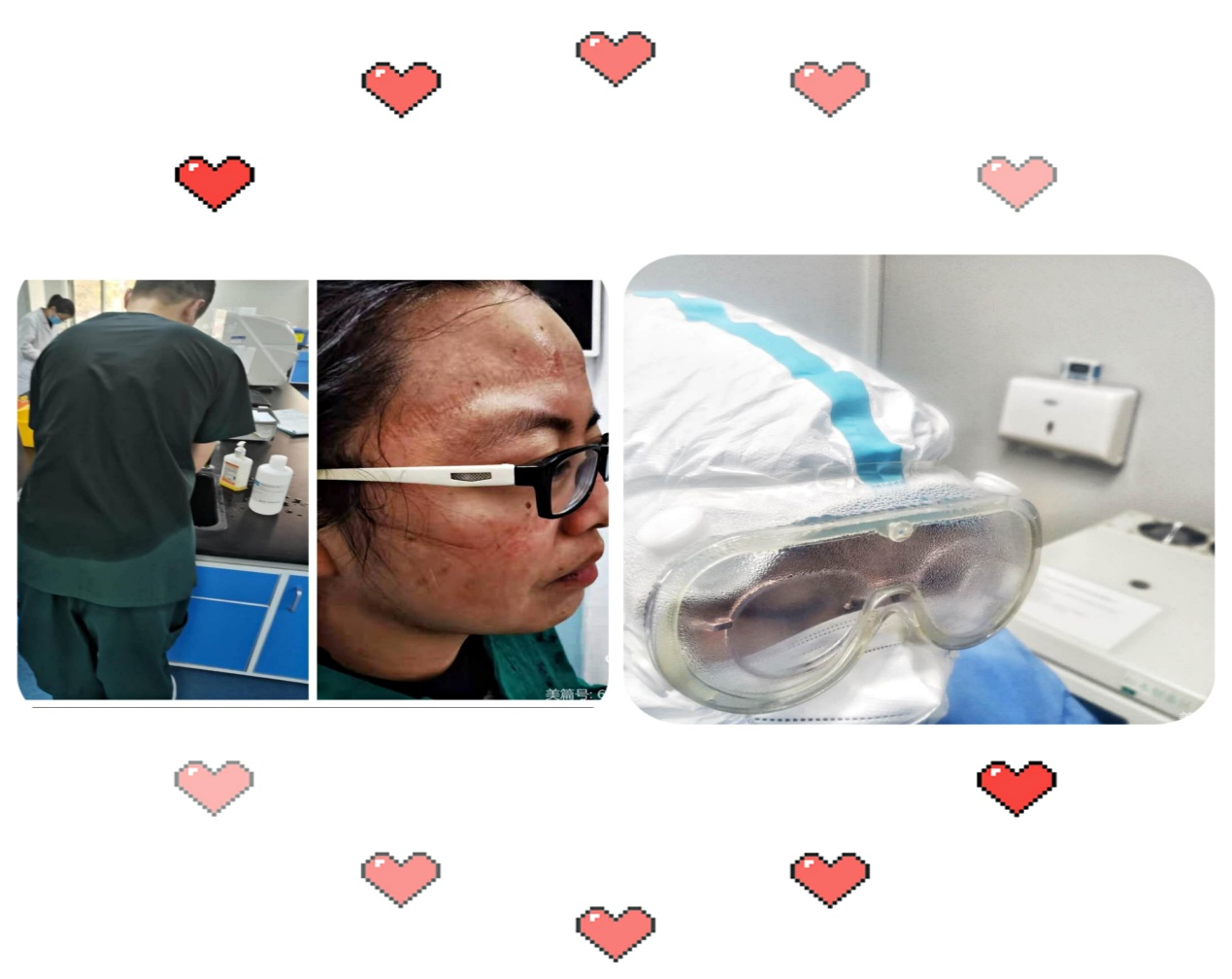 面对负压环境的实验室,检测人员一待就是几个小时,常常出现胸闷、气短的不适感,完成一次检验后大家都疲惫不堪,每次脱下防护服,衣服都会湿透,摘下口罩和护目镜后,脸上被口罩勒出了深深的印痕。检验科工作人员在实验室内,通过一份份标本和试剂战“疫”,在幕后守护着平安。