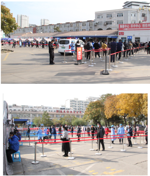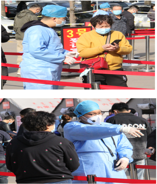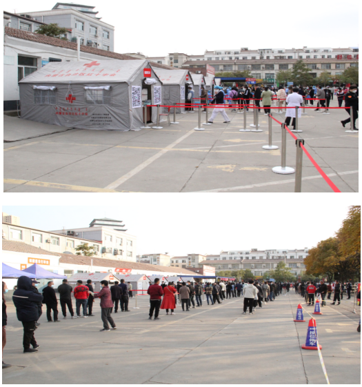 一顶顶帐篷并排开来, 不断有市民来排队进行核酸检测, 等待检测队伍浩浩荡荡, 但一切又是那样井然有序, 志愿者们耐心的指引着排队的市民, 扫码登记、解释问询、指导缴费、 动作干脆熟练, 一丝不苟。