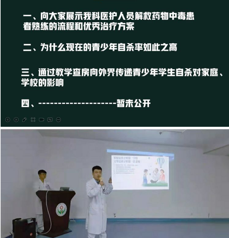 呼吸治疗师穆海鹏为大家介绍为什么本次查房选择《药物中毒》为题目,近年来随着社会发展未成年人上网率已经全覆盖,越来越多的孩子沉迷于网络、游戏、直播,已经严重影响了孩子们的成长和价值观。每天被网络毒鸡汤熏陶,变得不再思考求知,易暴躁,学习成绩下滑。我国每年青少年自杀高达数万人,我市每年亦有多起发生。父母是孩子的第一任老师,家庭教育的好坏直接影响孩子一生。作为医务人员,我们希望不仅能和死神抢人,更希望普及健康教育,让孩子们能深刻了解药物中毒的危害,直接在源头处减低发生率。