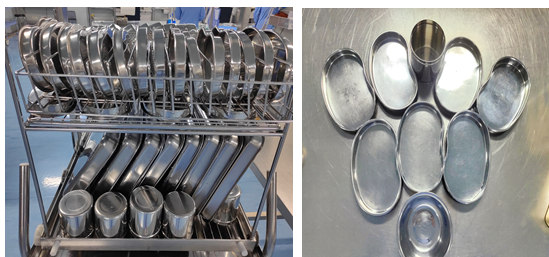 在清洗过程中发现器具类物品清洗后表面有白斑,工作人员集思广益,使用大整理箱配置多酶清洗剂,在器械回收分类后集中手工预处理,再放入全自动清洗消毒器清洗消毒,多次尝试不同的摆放方法对清洗效果的影响,最终白斑问题彻底改善。