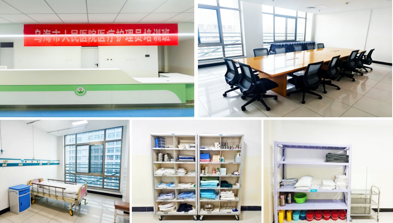 为满足培训需求,乌海市人民医院将旧外科大楼七楼指定区域划拨建设医疗护理员综合培训基地。基地硬件配置完善,共申请 11 间区域,包含 4 间病房、2 间办公室、1 间会议室、2 间治疗室、2 间库房,为培训提供基础空间支撑。同时培训基地还配备齐全的医疗器具和模拟设备,确保学员能够在真实还原的临床环境中进行反复练习,提升操作熟练度与应急处理能力。