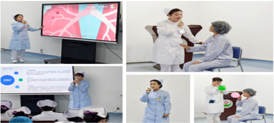 教学首先由实习生介绍肺结节相关知识、射频消融术及肺结节的六种治疗手段,以一名“右肺下叶混合磨玻璃结节”拟行手术的患者为案例,贯穿手术全周期。在术前护理环节,模拟了护士如何通过共情沟通缓解患者焦虑,并现场演示腹式呼吸、缩唇呼吸等呼吸功能锻炼方法,展现了心理支持与呼吸道准备的重要性。