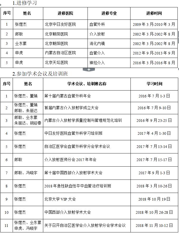 乌海市人民医院介入科于2014年2月8日正式成立,2014年11月学科扩展为介入血管外科。现有医护人员14名,其中医生6名,副主任医师3名,主治医师1名,住院医师2名,护理人员8名。