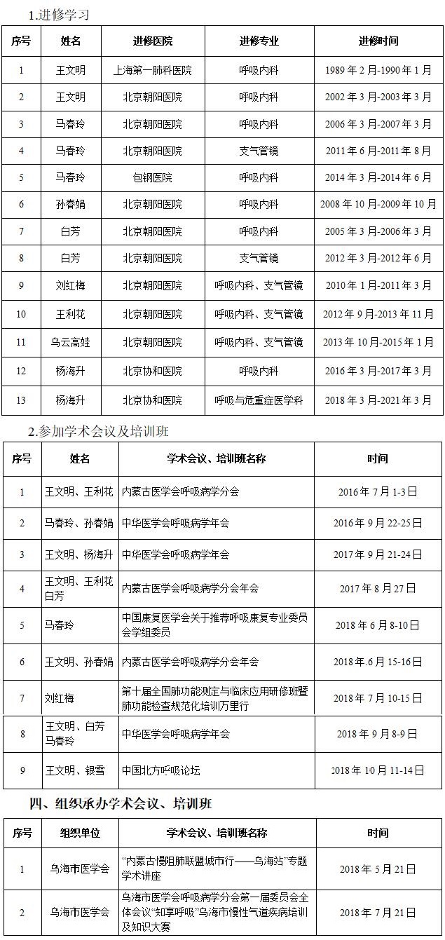 乌海市人民医院呼吸与危重症医学科于2008年独立建科,学科具有良好的人才梯队,现有医护人员29名,其中医生11名,主任医师2名,副主任医师1名,主治医师6名,住院医师2名,硕士研究生3名,护理人员18名,形成了一支比较合理的临床科研教学队伍。