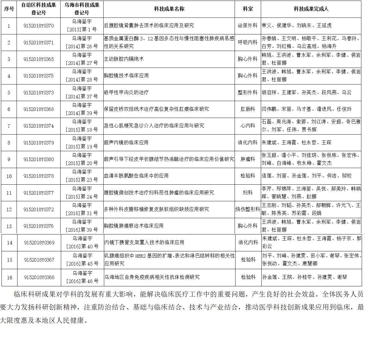 乌海市人民医院成功登记自治区科技成果16项,涵盖多个学科专业,具体项目如下: