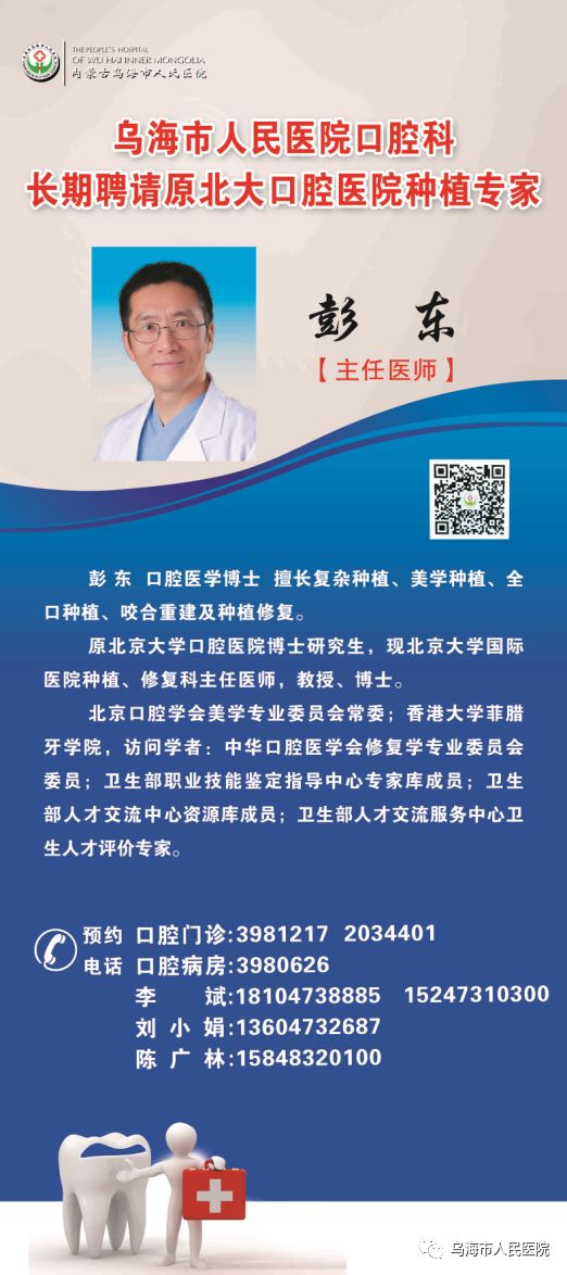 应广大患者要求,我院口腔种植科特聘请原北京大学口腔医院、现北京大学国际医院口腔种植、修复科主任、教授、博士及研究生导师彭东老师于6月30号、7月1号坐诊、手术。因全天手术、号源有限,如果您在种植方面有需求,敬请速速拨打电话与我们联系。