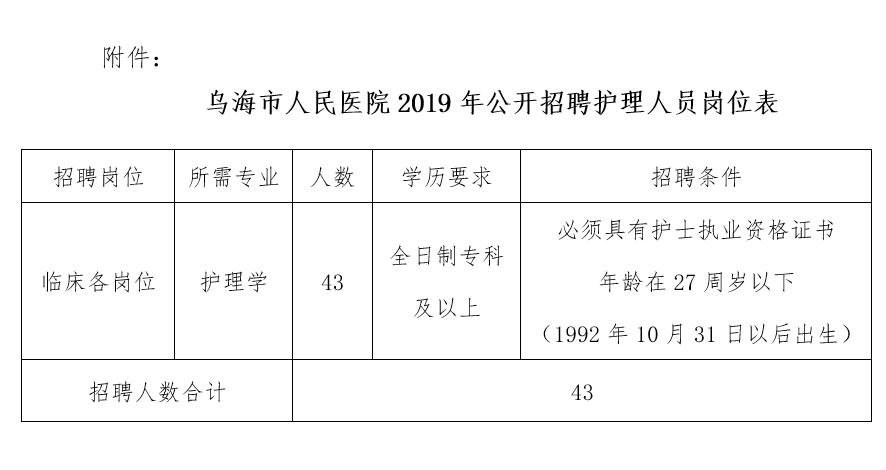 本次公开招聘护理人员共43人,具体岗位详见附件《乌海市人民医院2019年公开招聘护理人员岗位表》(以下简称《招聘岗位表》)。