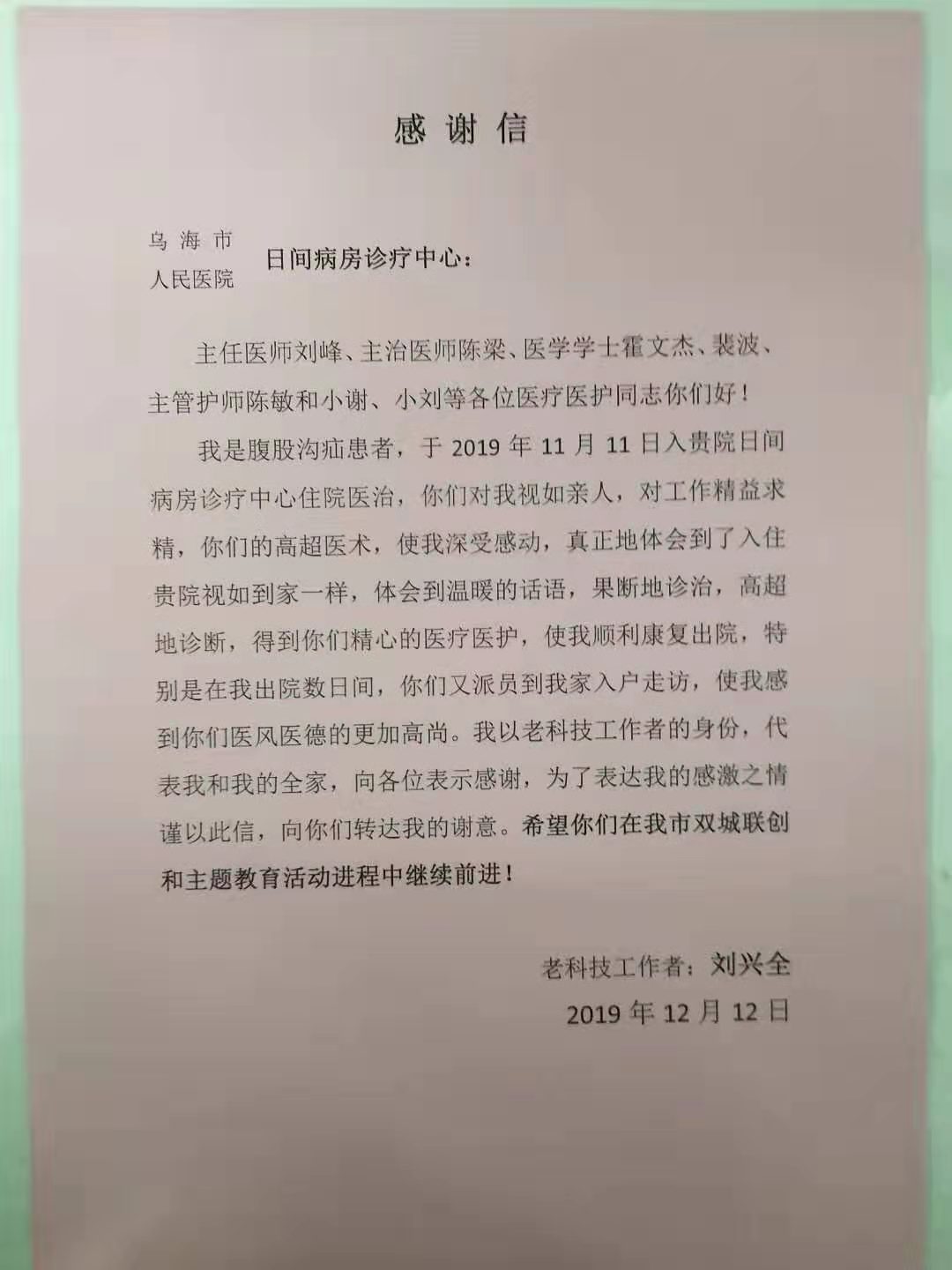 日间病房科收到患者来信