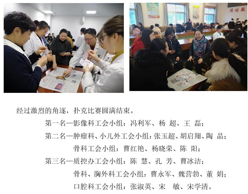 在喜迎新年到来之际,为了丰富职工的业余文化生活,展现职工激扬的青春与积极奋进的精神面貌,营造欢乐祥和的节日氛围,进一步增进全院职工的凝聚力、向心力,在院党委的大力支持下,1月18日举办了迎新春扑克比赛。