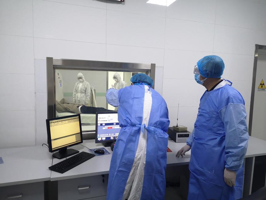 为了符合感控要求,必须对影像科现有格局进行改造,需要在CT室砸墙改门开辟独立通道。由于改造工期紧,连夜作业晚上只安装了门,其上方的洞口还没有进行封闭,晚上室内温度只有零上两三度。就在这样寒冷的夜晚,影像科的同志们依然坚守值班,并接诊了多名发热患者。他们没有人说一声冷,第二天仍然在自己的工作岗位上默默坚守着.....
