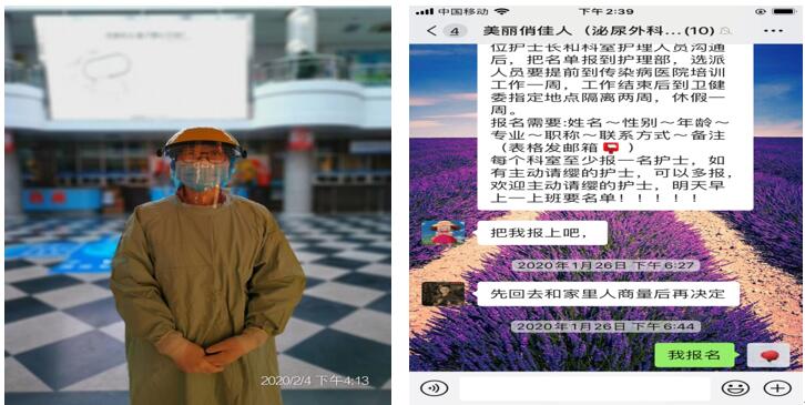 2020.2.1接到护理部紧急通知要求泌尿外科护士到呼吸隔离病房支援护理工作,于淑梅护士主动请缨加入“战斗”,已经上了一天班的她没有吃晚饭,也没有和领导说明情况,而是继续奋战了14小时的夜班,身心疲惫的她没有一句怨言,在这辛苦坚持的背后,还有重病卧床的老父亲更需要她的悉心照料,第二天我给他发信息说:于子,给我发张工作时的照片吧,她很干脆的发段语音给我说;亚丽姐,工作时穿防护服没有办法拍照的,要坚持8小时,还有不吃、 不喝、不上厕所的本事……听到这些我愕然了,流泪了,对于一个资深吃货来说时何其残忍,对于这场没有硝烟的战役带来的的恐慌、艰辛、责任所有的医务人员都明白,但如何成为一名真正的战士,除了义无反顾还需要更大的勇气,她做好到了。