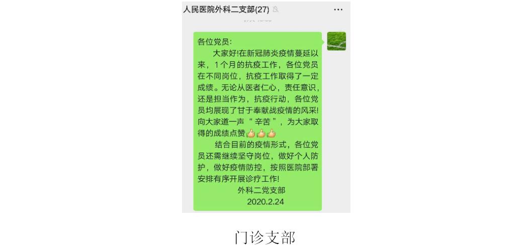 通过学习和讨论,再次激发了党员干部在疫情防控工作中勇于担当、冲锋在前的激情。支部书记说,在疫情面前,我们不是孤胆英雄,也没有看客,不止挡在病毒最前线的医生护士,每一个参与者都是英雄。一个支部就是一座堡垒,一名党员就是一面旗帜,疫情面前我们要主动担当,以实际行动践行初心使命、全力战胜疫情。 机关二支部 2月24日,在新冠肺炎疫情防控的关键时期,组织开展了不一样的“主题党日”,为减少人员聚集,减少一线医务人员自身风险,严格按照“不开会、不聚集”的工作要求,采取“学习强国”APP自学形式召开了党日活动,充分利用“学习强国”APP组织党员在线学习了习近平总书记在统筹推进新冠肺炎疫情防控和经济社会发展工作部署会议上的讲话会议精神。 内科支部 2月25日,内科党支部利用强国学习平台进行了线上视频主题党日活动,主题党日规定动作后,学习了新冠肺炎期间习近平总书记疫情防控重要讲话内容,学习了我院新冠肺炎文件汇编部分内容,传达了我院关于新冠肺炎工作安排及部署。 支部书记闫道普对疫情期间内科支部党员们的工作、生活情况进行细致的了解,督促大家在做好防疫工作的同时注意自我防护安全。 内科支部党员王玲敏同志的爱人丁叶飞是赴武汉支援医疗队的一员,作为ICU的一名护士,她一个人抗起工作、家庭的双重责任,他们舍小家为大家的精神感动了每一位党员。书记闫道普叮嘱王玲敏同志注意身体,有任何困难,组织都会积极帮助协调解决。 疫情期间,内科支部党员们在发热门诊,发热病房......在最需要的地方,留下了自己的足迹和汗水,他们不负使命,始终坚守,从未退缩。