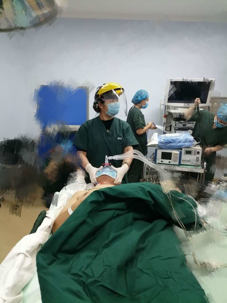 麻醉医生承担着全院危重患者的抢救任务,气管插管会直接面临呼吸道、飞沫、气溶胶和密切接触传播的风险,在新冠疫情期间医务人员被感染的风险就更高,虽然科室备有帽子、口罩、手套、隔离衣、防护面屏等防护用品,但是紧急气管插管就是与时间和生命在赛跑,防护不可能做到完美。从接到会诊电话到到达病床前的10分钟内真的就是另一场战役,麻醉医生需要迅速了解患者基本情况、穿好防护用品、带着插管箱奔跑于医院的各个病区,可想而知这是一个什么样的场面,如果你在走廊里看到全副武装奔跑着的工作人员,不用问,那一定是我们的麻醉医生!