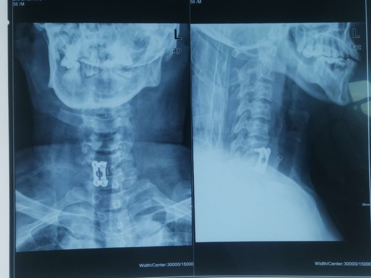 经CT显示,刘师傅胸部左侧肋骨多处骨折、肺部挫裂伤、颈部六七颈椎骨折脱位伴不完全瘫痪,“钢铁脊梁”组组长主任医师刘涛立即立即联系手术室备台,同时打电话叫来脊柱团队组员副主任医师张运动、住院医师张治河、住院医师王继龙,当天连夜为刘师傅进行“颈椎前路骨折脱位切开复位颈椎间盘切除椎间植骨融合CAGE植入椎管减压钛板前路固定术”。