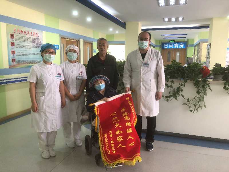 日间病房一肺癌晚期患者高烧50多天,经日间病房治疗后体温恢复正常,肿瘤控制稳定。患者和家属赠送锦旗表示感谢!