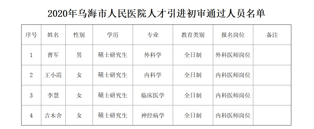 按照《2020年度乌海市人民医院人才引进工作简章》要求,现对2020年乌海市人民医院人才引进初审通过人员予以公示(公示名单见附件),公示时间为2020年11月17日-2020年11月23日。