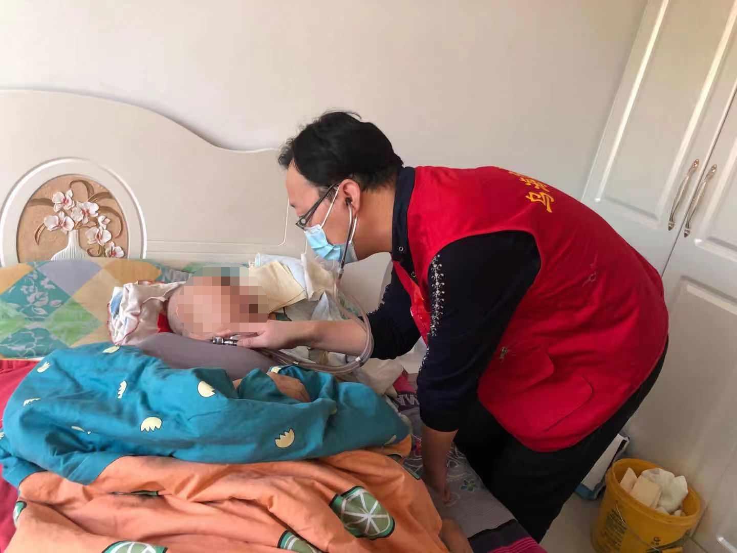 该患者今年10月份在乌海市人民医院神经外科做了颅内血肿清除术和气管切开术,12月初好转出院。因担心患者气管切开处感染和患者偏瘫情况,了解到老人来医院不方便,护士长特意准备了换药包、敷料等换药用物,来到了王秀连老人家。