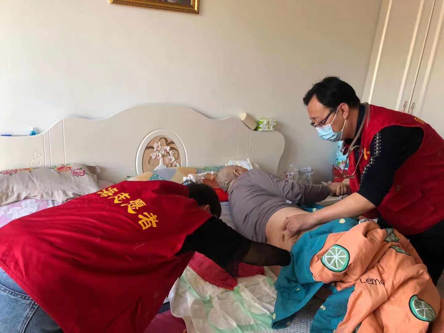在患者家中,胥国峰医生为患者清理气管切开处淤积的痰液,告知家属及时清理痰液的重要性及清理痰液的方法,并为患者检查肺部情况。