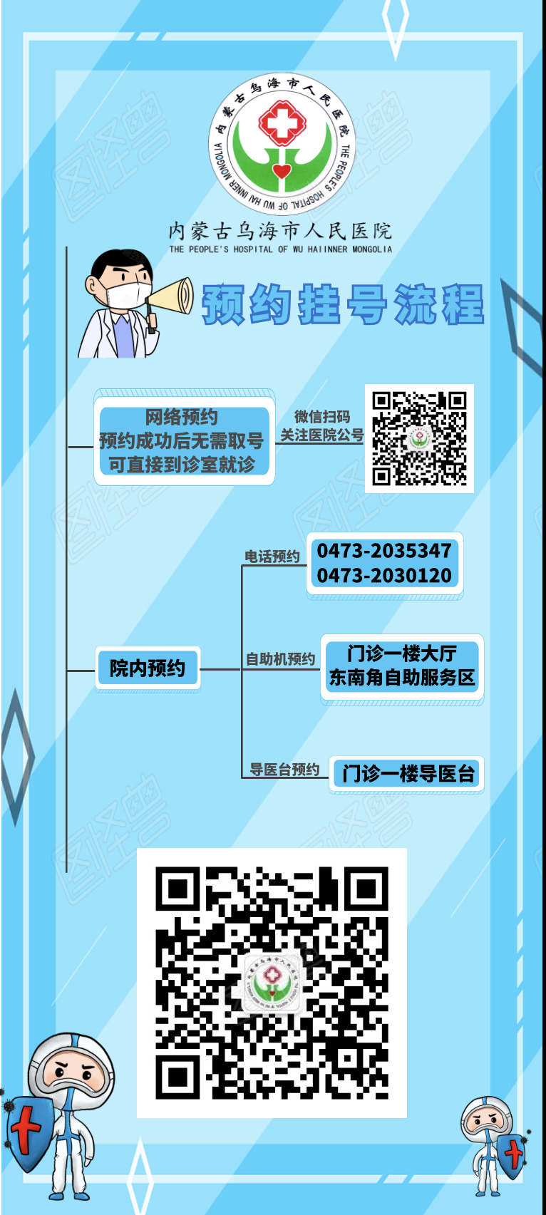 1.实行预约挂号,来院就诊者提前通过关注乌海市人民医院微信公众号等方式,在网上完成预约挂号。