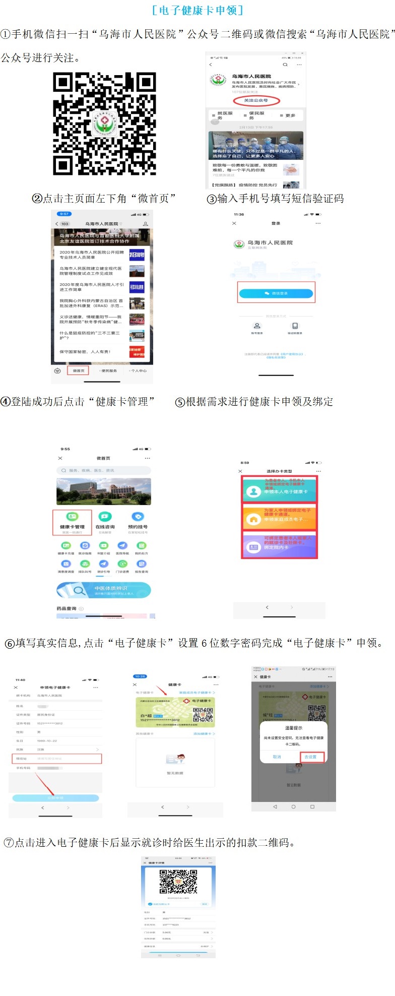 网上预约方法 如果您需要就诊请按照以下方法操作: 【网络预约】请关注“乌海市人民医院”官方微信公众号或APP,查阅最新的通告和挂号信息,点击“预约挂号”查询医生坐诊排班信息,通过网络挂号渠道进行预约挂号。您可以通过以下方式进行“电子健康卡申领”及“预约挂号”: