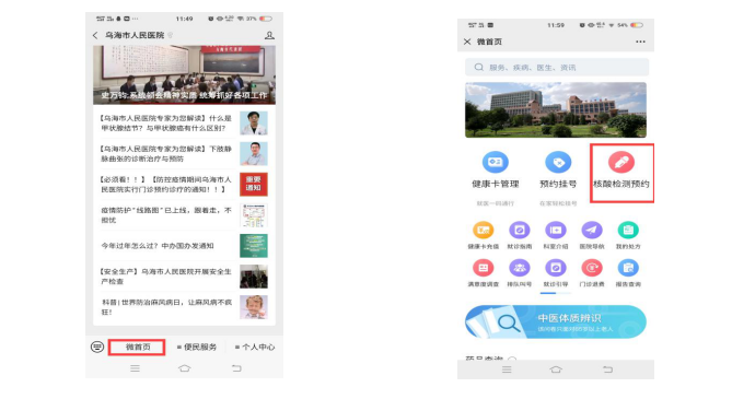 进入公众号首页,点击左下角“微首页” 选择“核酸检测预约”