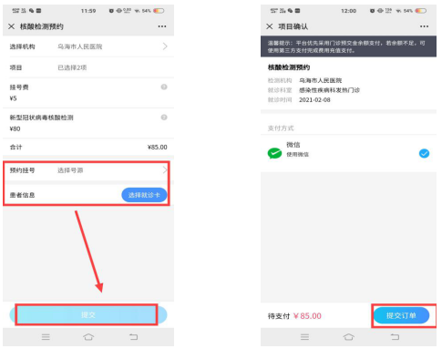 选择号源及就诊卡并提交 项目确认后进行缴费