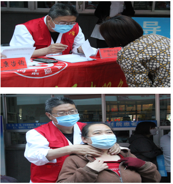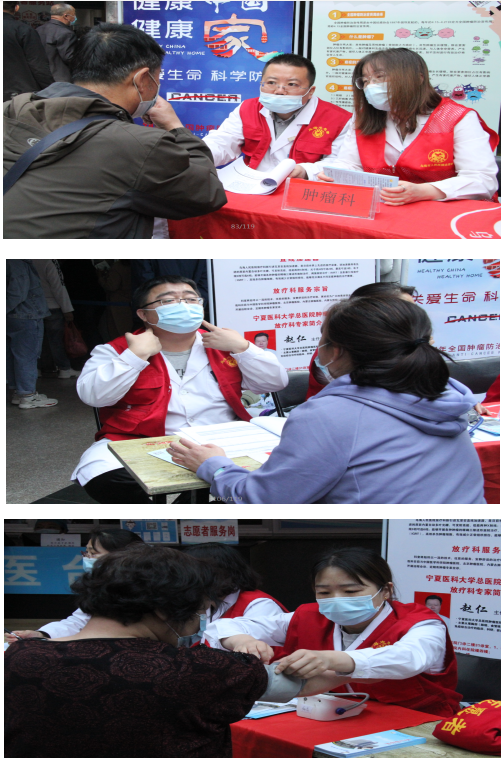 活动中,医院肿瘤科主任、主任医师张玉超、副主任医师牧永峥、李广茂、主治医师周宇、贺云霞;放疗科主任、主任医师闫海英、副主任医师雷海龙、医生刘培燕、刘轩等人为前来问诊的患者进行免费测量血压血糖、义诊等服务,针对他们不同的病情问询提供不同的宣教、生活指导等多种健康知识的讲解。