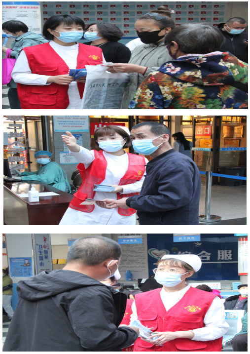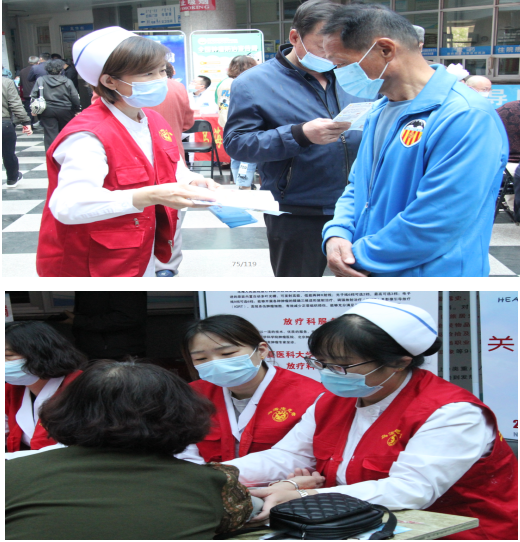 肿瘤科护士长、副主任护师刘佳玥、护师张桂园、王金米、韩银平、武斌;综合病房护士长刘小娟、苏娟等人通过肿瘤健康知识宣传展板、现场发放肿瘤健康宣传知识手册等方式向前来我院就诊的患者进行肿瘤健康知识宣讲,普及健康知识。