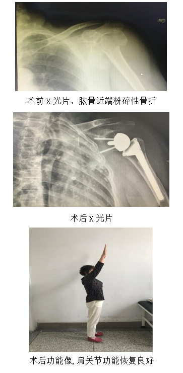 患者,女,63岁,“车祸致左肱骨头粉碎性骨折”入院。因肱骨头粉碎严重,骨折块不能用钢板内固定来复位,最后决定进行肩关节置换。患者骨质疏松严重合并肩袖损伤,不能通过固定肱骨大小结节来重建肩袖,单纯肱骨头置换效果差,因此,行反向肩关节置换是最佳选择,术后效果良好。