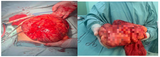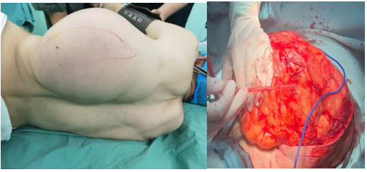 该患者是一位56岁的男性患者,10年前就发现背部约鸡蛋大小肿物,因自己无任何不适的感觉,就未行治疗。2020年开始生长增快到约成人脑袋大小,影响正常生活。来我院就诊后,CT检查结果:胸背部皮下巨大占位,恶性可能。随即在我院肿瘤科住院准备进行手术治疗。