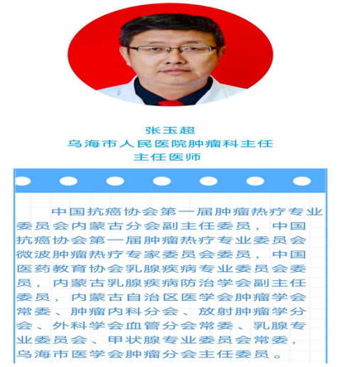 希望我们的努力,是您伤痛中的一缕阳光,我们的汗水,是您康复路上渴求的一滴甘露,让我们共同努力助您重返社会。 乌海市人民医院肿瘤科张玉超主任:每周一、周三全天专家门诊,为您的健康保驾护航。