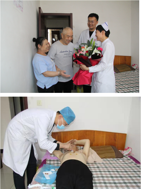 到患者家中由张强大夫为其查看了患者的术区伤口,并给于伤口换药,护士韩永琴为其测量了血压,鼓励其加强术后康复指导,护士长杜丽娜为患者进行了如何做到用药安全,告知其定期复查,给予了详细健康的饮食指导,并向患者及家属征求了在住院期间的意见及建议。