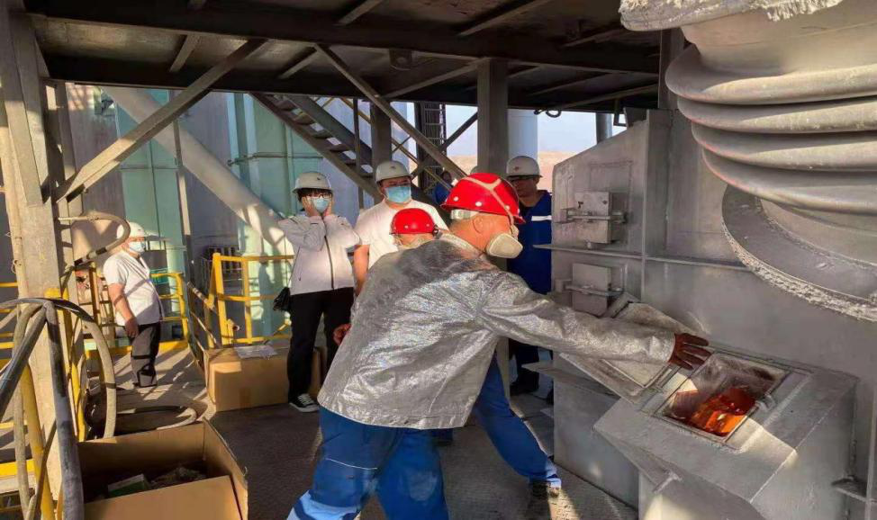 在室外温度28摄氏度,水泥烧造回转窑炉前温度1600摄氏度的高温、高热环境下,药剂科主任刘光峰及海勃湾区市场监管局执法人员、保卫科保安员登上20米高炉前监督销毁此次麻醉、精一药品。