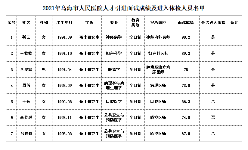 2021年乌海市人民医院人才引进面试成绩及进入体检人员公告